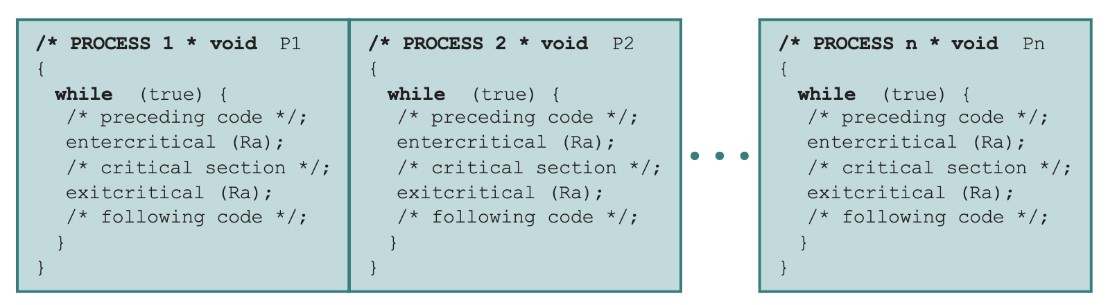 - 프로세서의 개수나 상대적인 프로세스 수행 속도에 대한 가정은 없어야 함.