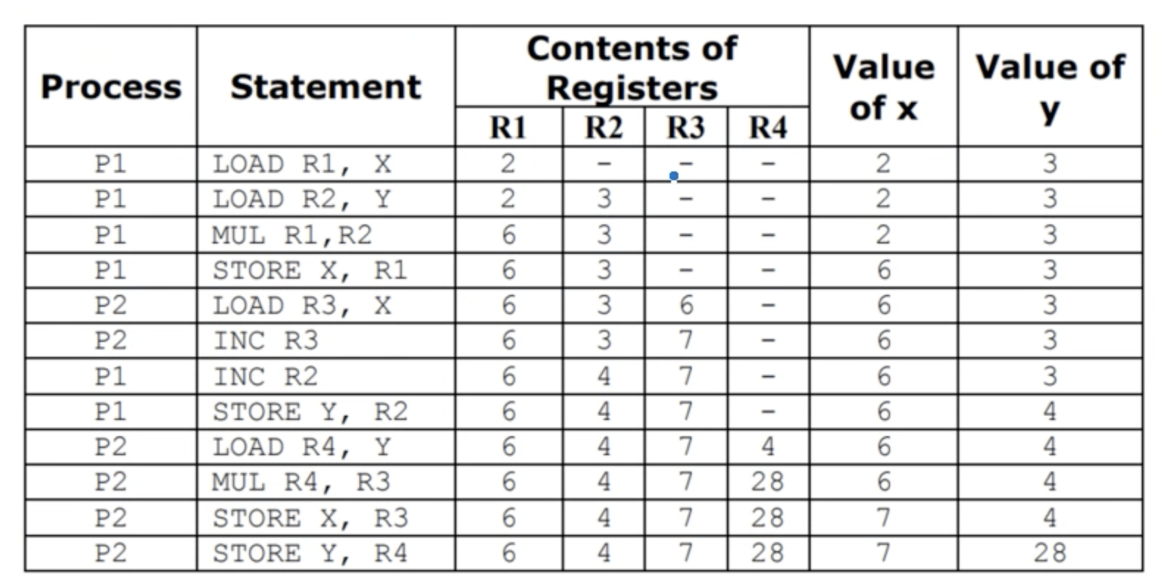 x := x * y에서LOAD R1, XX의 값을 R1(레지스터)에 로드LOAD R2, YY의 값을 R2(레지스터)에 로드MUL R1, R2R1에 R2의 값을 곱하여 R1에 갱신STORE X, R1R1의 값을 X에 저장