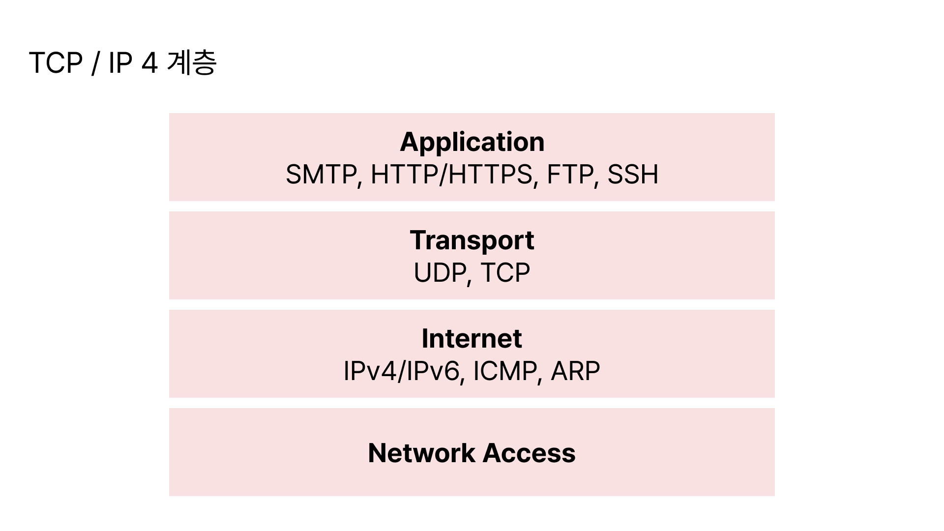 TCP / IP 4계층은 장치들이 인터넷 상에서 데이터를 주고받을 때 쓰는 프로토콜의 집합입니다. 4계층 혹은 7계층으로 나누어집니다.