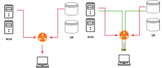 위 그림처럼 중간에 로드 밸런서 부분에서 병목현상이 일어난다는 것을 파악, 서버, DB로 부터 회선을 더 추가하여 병목현상 해결 가능