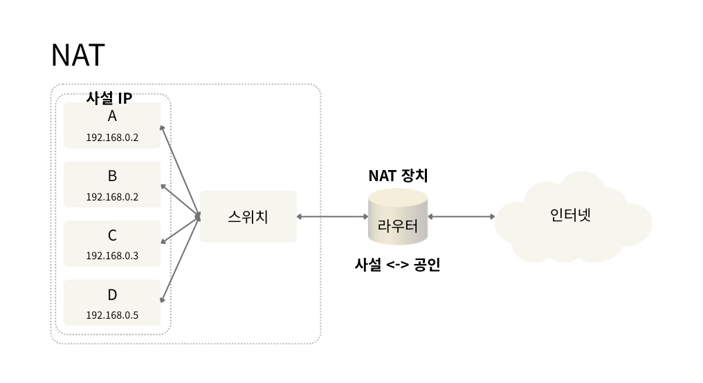 - NAT(Network Address Translation)은 패킷이 트래픽 라우팅 장치를 통해 전송되는 동안 패킷의 IP 주소를 변경, IP주소를 다른 IP주소로 매핑하는 방법