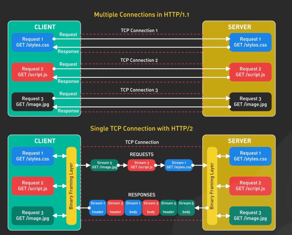 - HTTP/1.1에서는 병렬 요청을 하려면 다중 TCP 연결을 통해 진행하고, TCP 연결 하나당 병렬 요청은 불가능했다.