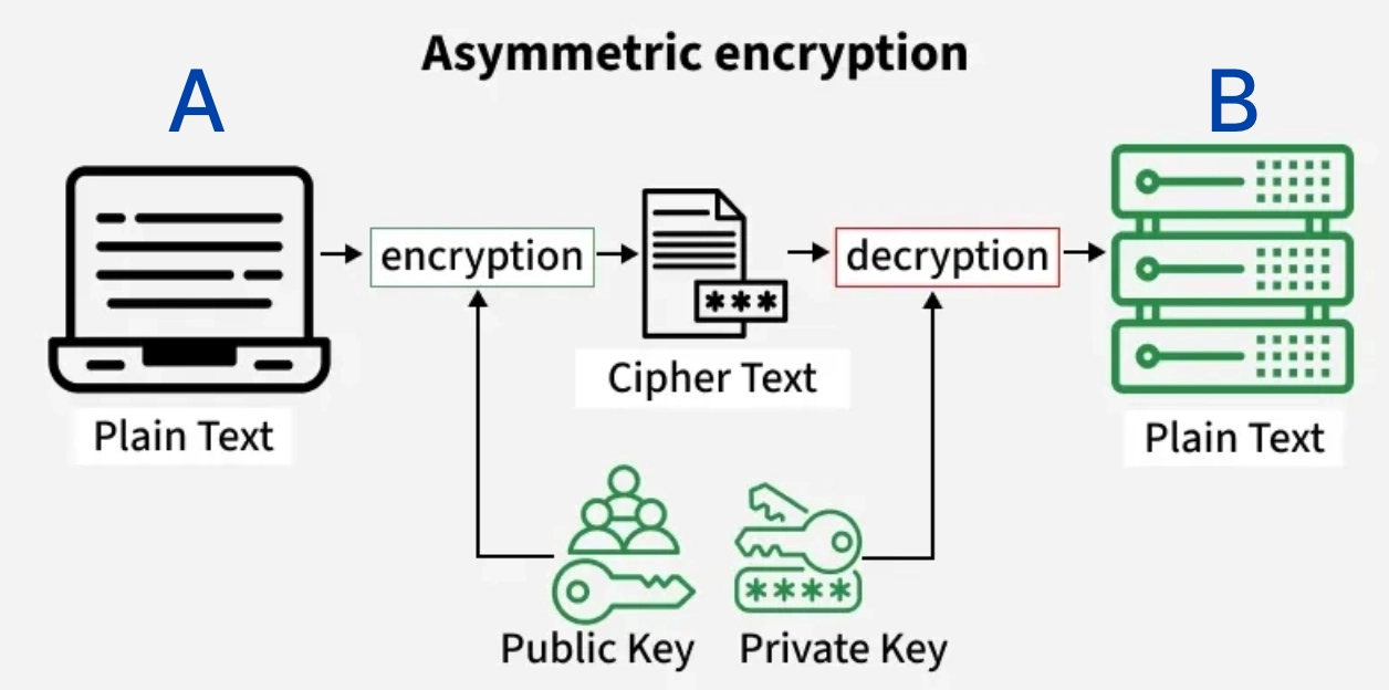 - 이 메시지는 오직 B의 개인키로만 복호화할 수 있음 즉, A는 암호화만 하고, B만 읽을 수 있음