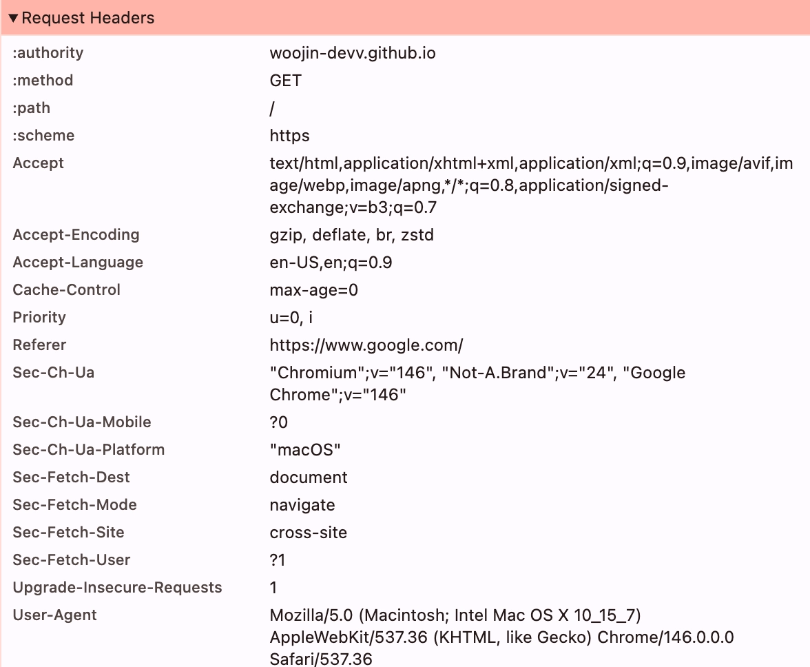 요청한 URL, 요청 메서드, 해당 자원을 요청할 때 해당 자원의 출처를 나타내는 URL을 노출시킬 지 말지를 정하는 보안정도가 설정되어 있는 Referrer Policy 등이 들어감.