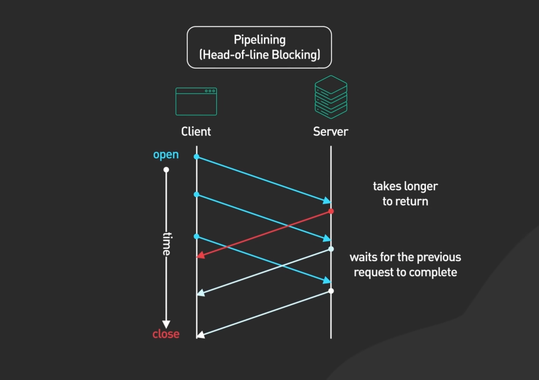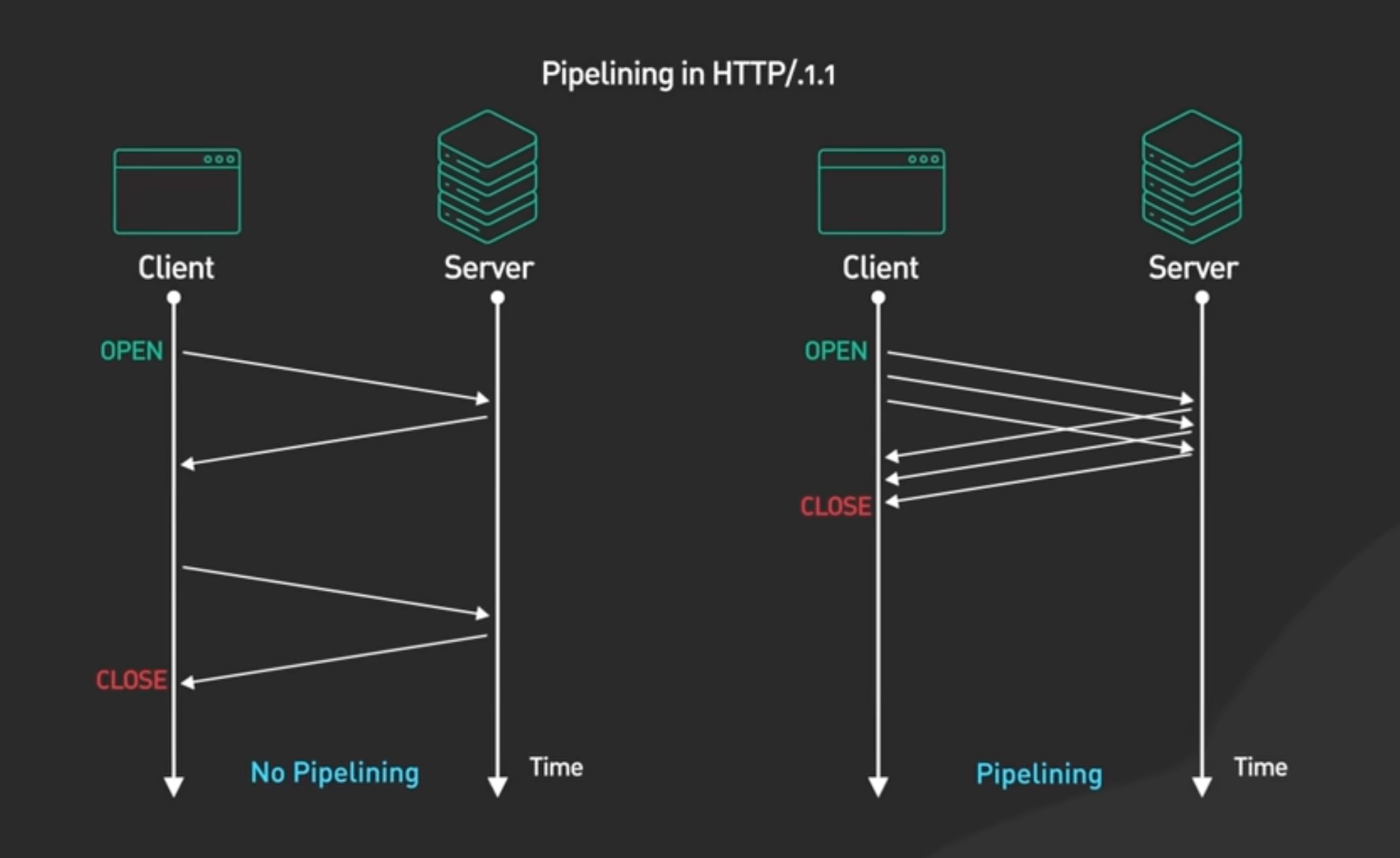 HTTP/1.1은 이전 버전의 비효율을 해결하기 위해 파이프라이닝(Pipelining)을 도입하였음. 응답을 기다리지 않고 여러 요청을 연속해서 보내는 방식.