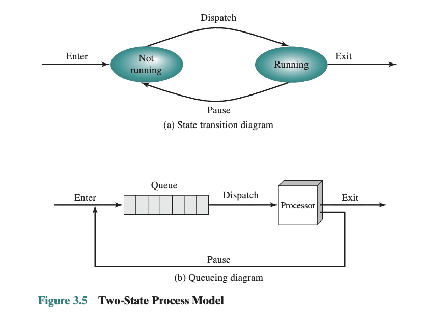 - two-state 프로세스 모델에서는 실행 중인 프로세스에 인터럽트가 발생하면 Not Running 상태로 전환된다. 그런데 단일 큐(single queue)를 사용하는 경우, 디스패처가 어떤 프로세스를 우선 실행시킬지 판단하기가 까다로워진다.